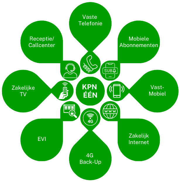 In samenwerking met KPN ÉÉN bieden wij een compleet en eenvoudig overzicht van diensten die jouw bedrijf optimaal ondersteunen. Of je nu op kantoor bent, thuis werkt of onderweg bent, met KPN ÉÉN zorgen we ervoor dat je altijd en overal bereikbaar bent. Deze oplossing voor het mkb maakt soepele communicatie mogelijk, volledig aanpasbaar aan jouw wensen, met opties voor vaste en mobiele telefonie, software en internet. Alles overzichtelijk op één factuur van Company Connect.